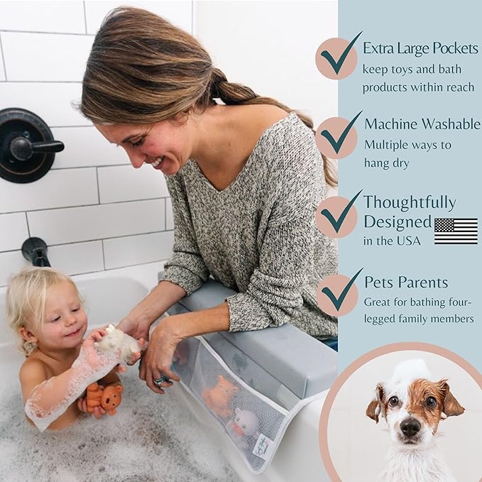 - Improved Suction Cups: The four large, top-quality, ribbed suction cups on the back of our baby bath tub set have a secure and stable grip, preventing any unwanted slippage during use. There are 4 extra-large pockets on the bath tub arm rest pad which allows the parent to keep more toys and bath products.