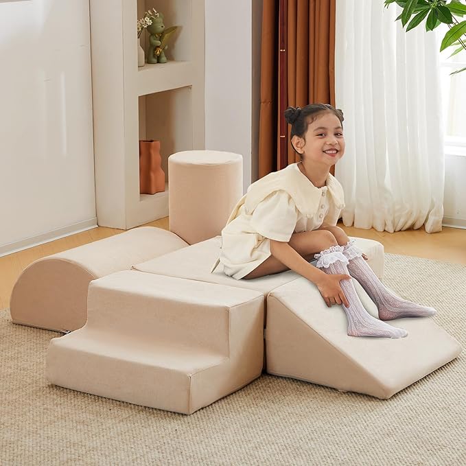 jela Kids Foam Climbing Blocks 6Pcs Soft Play Equipment Luxury Miss Fabric Toddler Climbing Toys Indoor, Lightweight Climbing Blocks for Babies, Kids, Climb and Crawl Foam Playset (Sand Beige)