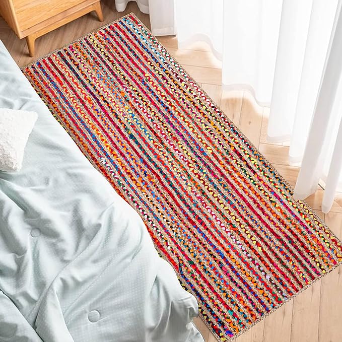 Hausattire Bohemian Braided Runner Rug 2'x6' - Multi Color, Long Farmhouse Jute Cotton Area Rag Rugs for Hallway, Kids Bedroom, Kitchen | Colorful Hand Woven Reversible Floor Carpet - 24x72 Inch