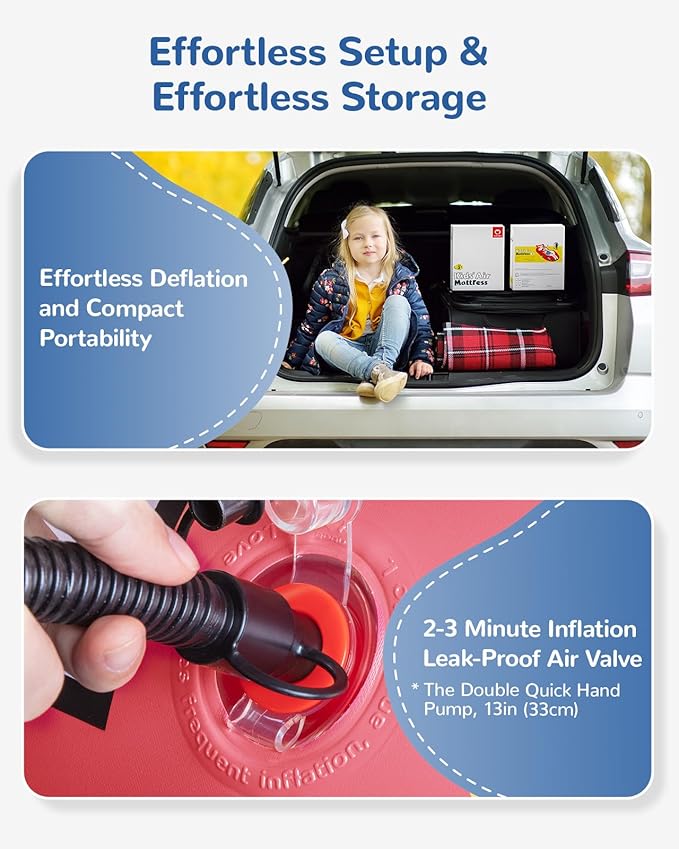 - Effortless Convenience: Use the equipped hand pump to inflate the kids travel bed to good work condition quickly. The innovative 2-in-1 inflation port design ensures an airtight seal, effectively preventing any pesky air leaks. Made from durable, thickened PVC material, it's built to last, ensuring your child enjoys countless nights of comfortable sleep.