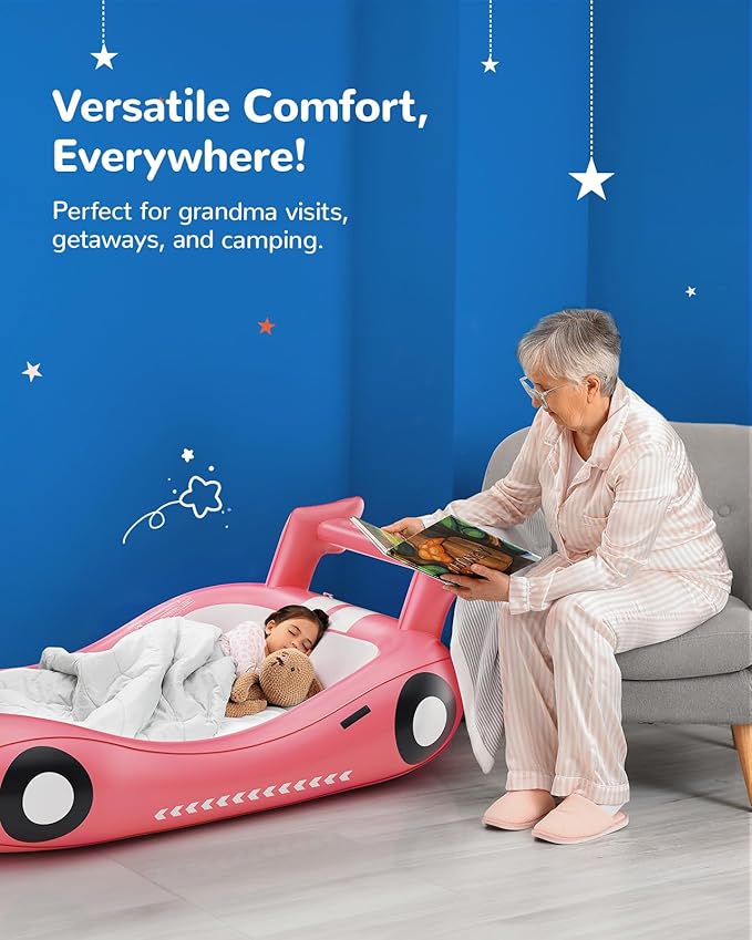 - Exciting Racing Car Design: Unlike regular kids travel beds, this air mattress with sides gives kids a chic bed experience with its racing car shape, adding a unique decorative element to the room. The cool racing car appearance, complete with vibrant printing details, as if you are in a real racing car is a surprise gift for little car fans.