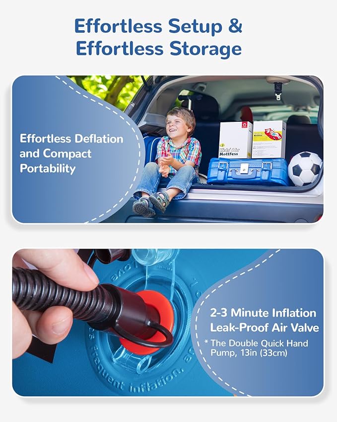 - Effortless Convenience: Use the equipped hand pump to inflate the kids travel bed to good work condition quickly. The innovative 2-in-1 inflation port design ensures an airtight seal, effectively preventing any pesky air leaks. Made from durable, thickened PVC material, it's built to last, ensuring your child enjoys countless nights of comfortable sleep.
