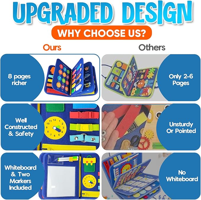 - π [8 PAGES, BRAND NEW DESIGN] - Our upgraded busy board for toddlers has 8 pages to play games and learn! Keep your baby entertained while they develop essential skills like dressing at their own pace, improving fine motor skills and finger dexterity. This toddler busy board is designed to help kids learn basic life skills, preschool activities, and cognitive skill.