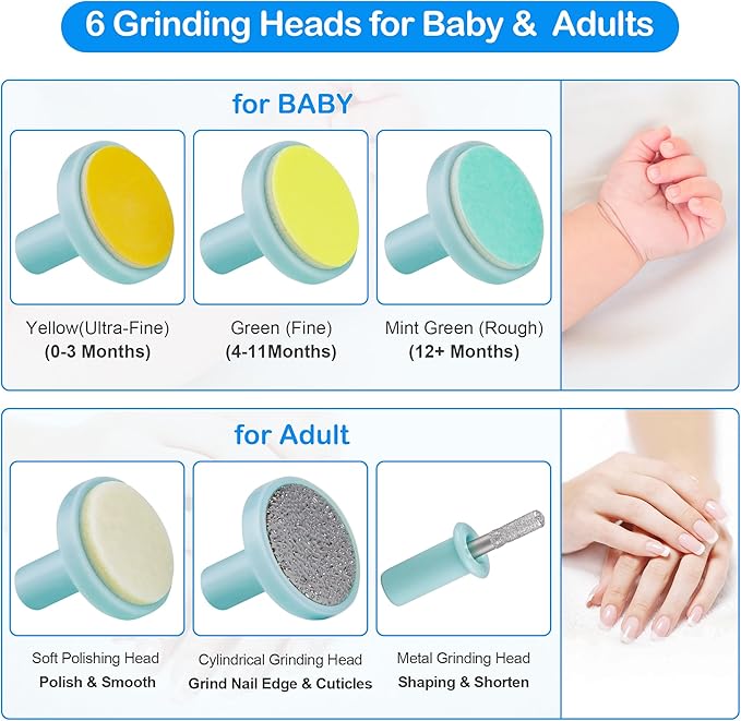 - 8 in 1 Electric Baby Nail Clippers Set: OTTOLIVES newborn grooming kit is equipped with 1 electric nail trimmer and 7 trimmer attachments (6 grinding heads & 1 nail Clipper) The 6 grinding pads can satisfy the nail repair of babies at different ages without damaging the delicate epidermis or nail bed. In addition, this is also suitable for adults