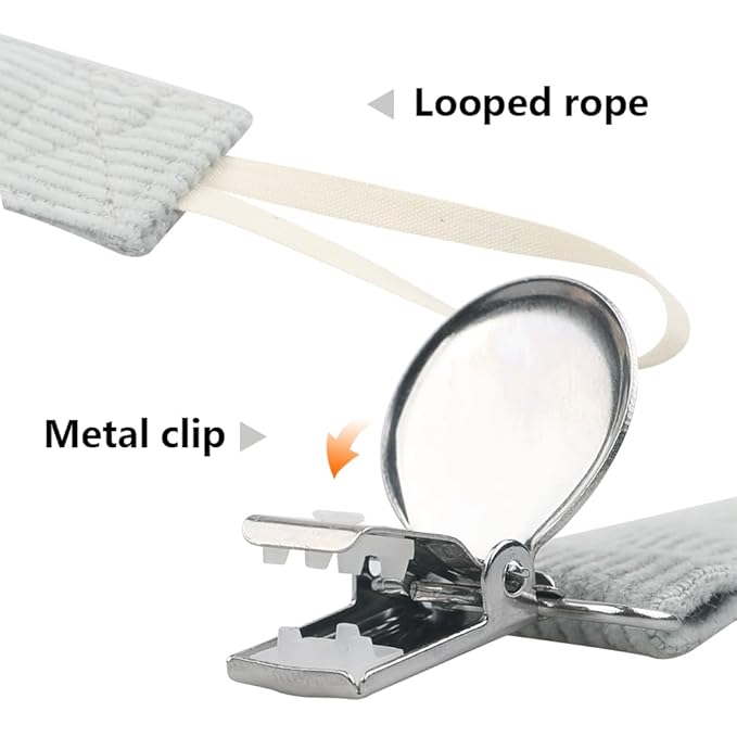 - UNIVERSAL CLIP-The strap is a universal pacifier leash designed with a loop to be compatible with all types of pacifiers. It can hold soother, burp cloths, teething rings, baby blankets, and drool bibs.