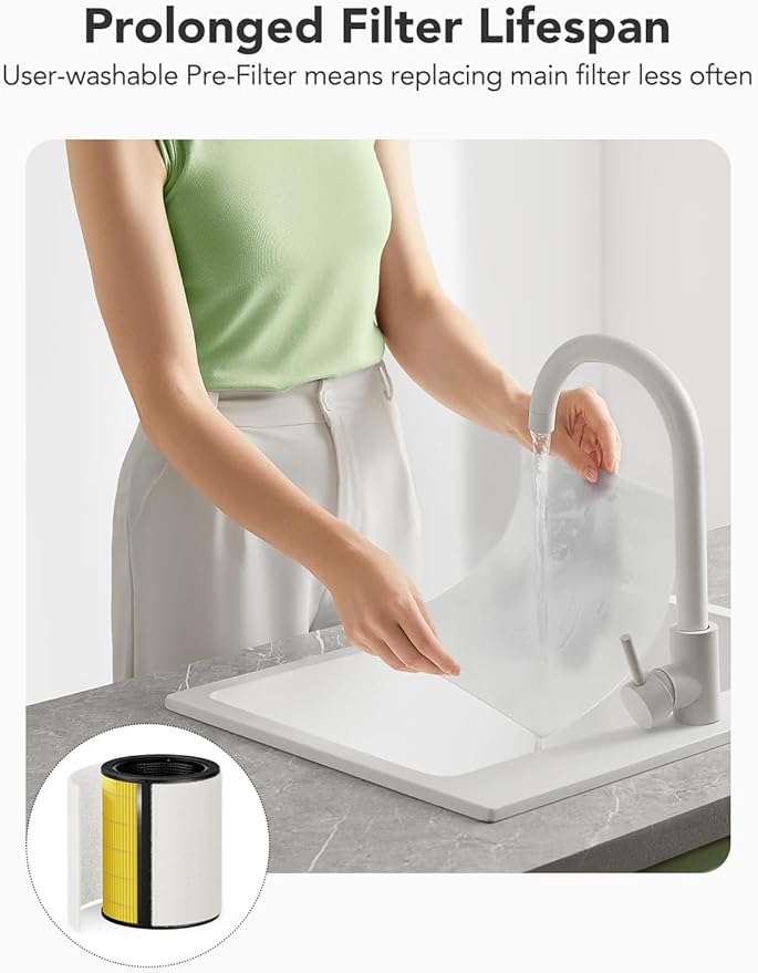 - Low Noise & Washable Pre-Filter: This bedroom air purifier operates at a near silent 24dB while you sleep, and the display lights can be turned off. The front filter supports disassembly and cleaning.
