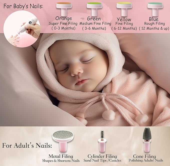 - [Rechargeable New 22 in 1 VALUE SET]:4 cushioned sandpaper attachment tools for baby's nails & 2 for adult's nails. 1 Type-C USB cable. BONUS: 13 EXTRA replacement tools (12 for baby & 1 for adult). Save more from our value set. USAGE LABELED Organzing Case