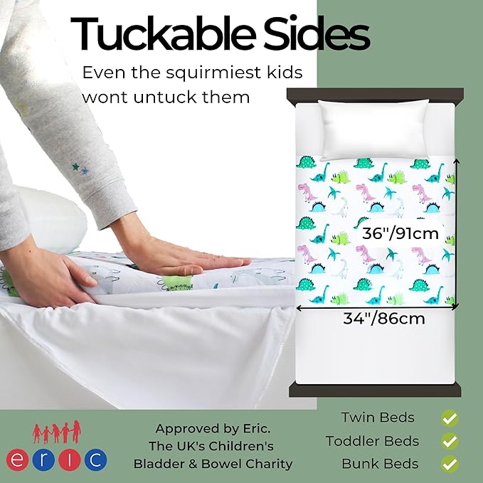 - 🦕 DOESN'T MOVE IN THE NIGHT - Many bed mats for bedwetting leak as they don't have tucks which hold the potty training mat in place. And let’s face it - kids can be wriggly at night. The tucks wrap around either side of the mattress ensuring it doesn't move.