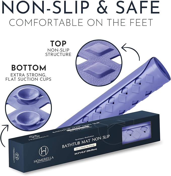 homerella® Bath Mat for Tub Non Slip Mold Resistant 35x16 - Shower Mat Non Slip Anti Mold - Bath Tub Mat Suction Cups incl. Hooks for Drying - Bathtub Mat Non Slip - ANI Slip Shower Mat Inside Tub