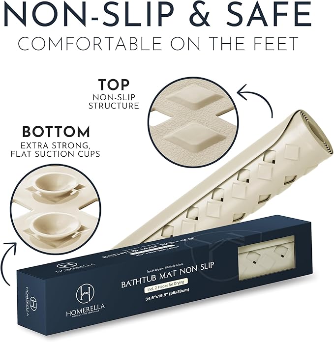 homerella® Bath Mat for Tub Non Slip Mold Resistant 35x16 - Shower Mat Anti Mold - Bath Mat Suction Cups incl. Hooks for Drying - Bathtub Mat Non Slip - ANI Slip Shower Mat Inside