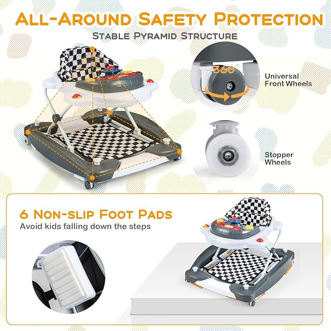 - 【All-Around Safety Protection】 This ASTM & CPSIA certificated baby walker features 6 anti-slip pads (auxiliary brakes) to eliminate the risk of falling down stairs or rolling down slopes. With a safety distance reserved between the front of the walker and the wall, it prevents finger pinching for a safe world exploration. The universal front wheels provide flexible and smooth steering, while the speed-reduction rear wheels ensure safe control.