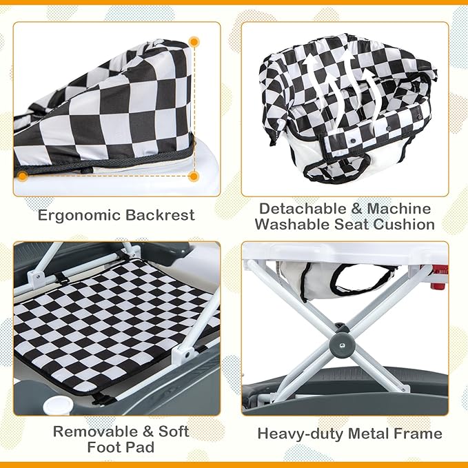 - 【Child-Friendly Material & Design】 Our baby walker is made of high-quality and safe PP material, ensuring peace of mind with every touch. The smooth and rounded body is free of edges and burrs. The 95° ergonomic high backrest provides optimal spine support. The comfortable and breathable cushion is removable and machine washable for convenient cleaning.