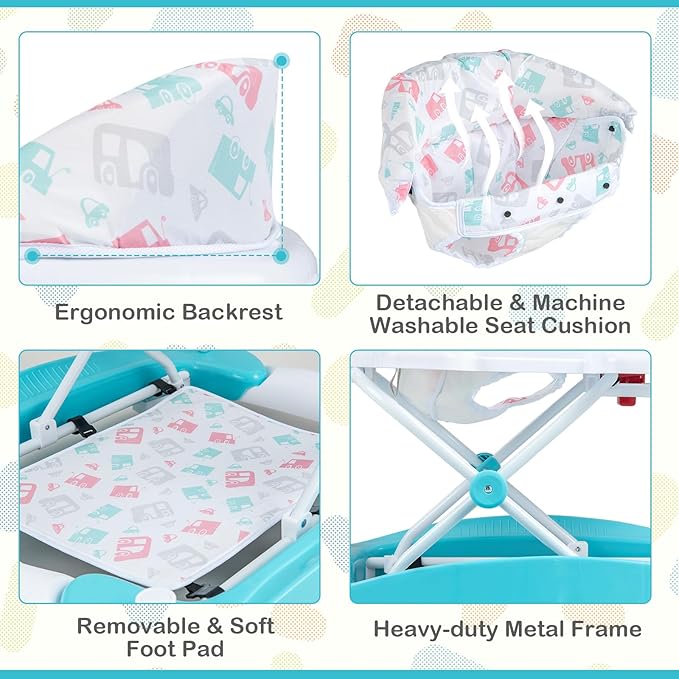 - 【Child-Friendly Material & Design】 Our baby walker is made of high-quality and safe PP material, ensuring peace of mind with every touch. The smooth and rounded body is free of edges and burrs. The 95° ergonomic high backrest provides optimal spine support. The comfortable and breathable cushion is removable and machine washable for convenient cleaning.