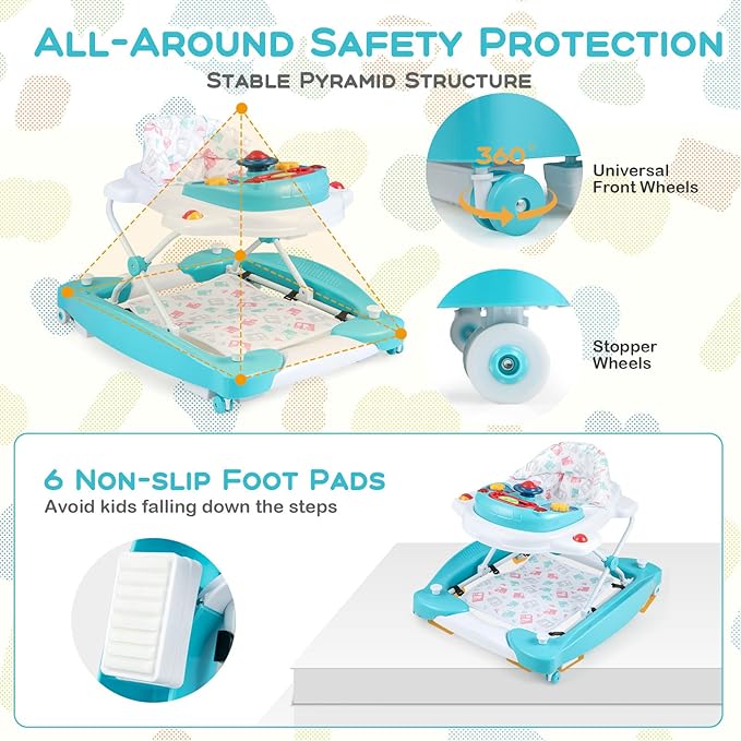 - 【All-Around Safety Protection】 This ASTM & CPSIA certificated baby walker features 6 anti-slip pads (auxiliary brakes) to eliminate the risk of falling down stairs or rolling down slopes. With a safety distance reserved between the front of the walker and the wall, it prevents finger pinching for a safe world exploration. The universal front wheels provide flexible and smooth steering, while the speed-reduction rear wheels ensure safe control.