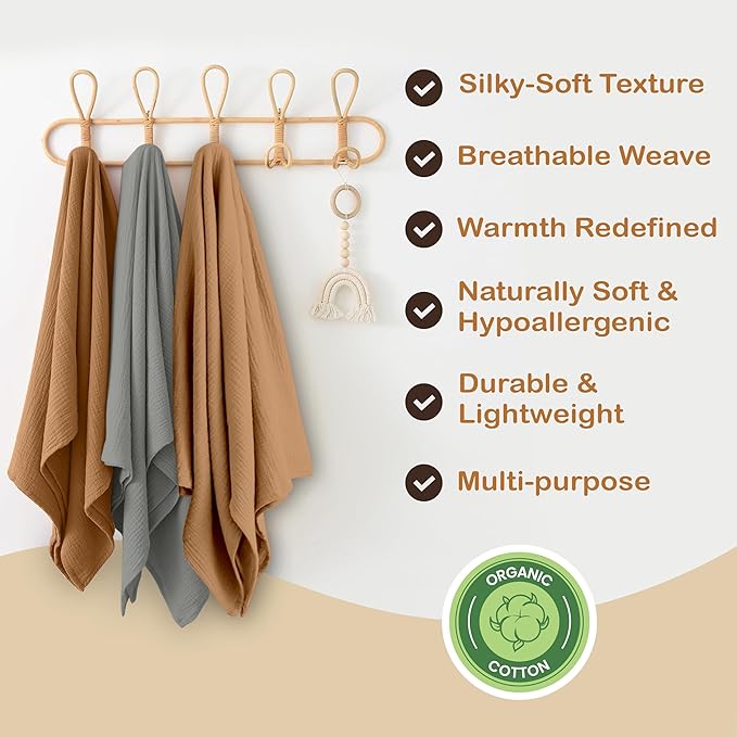 - ๐๐ฒ๐ป๐๐น๐ฒ ๐ฎ๐ป๐ฑ ๐๐๐ฝ๐ผ๐ฎ๐น๐น๐ฒ๐ฟ๐ด๐ฒ๐ป๐ถ๐ฐ: Our muslin baby blanket pack is made from organic cotton, providing a soft, breathable touch for delicate skin. Ideal for swaddle blankets for baby boys and girls, these blankets reduce the risk of skin irritation and allergies.