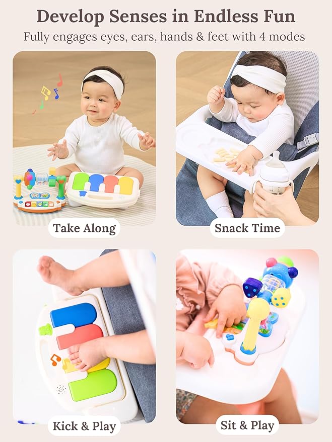 - 【Bouncer with Toy Bar Combo】Fully engage your baby's eyes, ears, hands, and feet. The finger piano with colorful lights encourages musical exploration, responding to your little musician's gentle touch. The kick-n-play piano develops cause and effect understanding and motor skills. Each piano comes with multi modes for endless fun. Rotating toys stimulate the fingers and curiosity. *Toys are typically for 9 months or older according to baby's height.