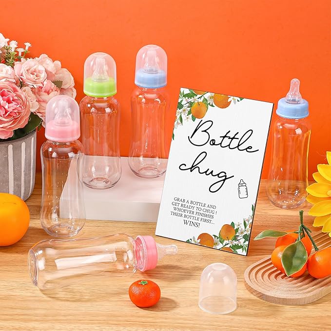- Functional and Beautiful Design: the baby shower game sign is decorated with oranges and leaves, elegant and attractive, and can bring more color to your party; Besides, its surface is printed with explainable words, which allow you to understand how to play this bottle chug game at once