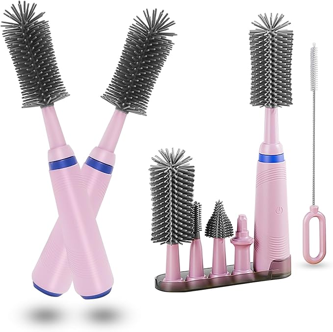 Electric Bottle Brush with Stand and Extendable Handle,Silicone Bottle Brush Set with Water Bottle/Nipple/Straw Brush,Easy-Grip Silicone Handle,Waterproof/Rechargeable Brush, Pink