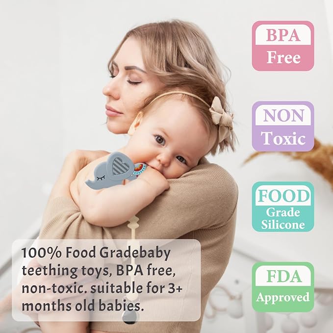 - One-piece Design: The safe, stylish, multifunctional baby silicone teether toys features one-piece design pacifier clip and colourful elephant teether design. No need to worry about falling apart, and there’s zero choking hazard. The unique teether combines soft colors and multiple textures, both the teether toys and clips are durable and easy to hold, allows your baby to use without burden.