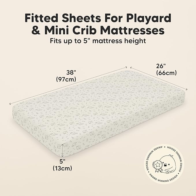- 2-Pack Mini Crib Sheets - Each KeaBabies Soothe Mini Crib Sheets set comes with two organic mini crib sheets for boys and girls that can perfectly fit the pack and play mattress pads and mini crib mattresses sized at 38” x 26” up to 5” height.