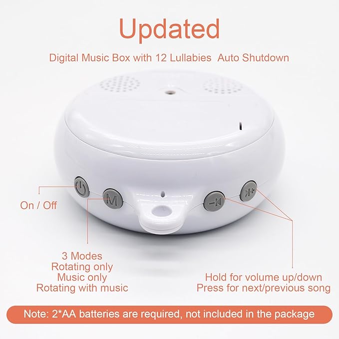 - Updated Digital Music Box: The musical mobile for crib comes with a music box with 12 soft lullabies, less Christmas songs, helping to calm the baby and reduce crying, and improve sleep quality, the music box has been upgraded to 3 modes, turn only, music only, turn & music, which meets more needs, attracting the baby's interest, promoting the baby's visual development and exercising hand-eye coordination, the music box requires 2*AA batteries (not included in the package)