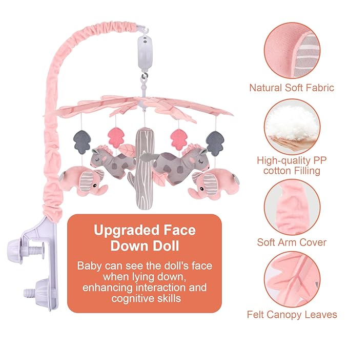 - Soft and Skin-friendly: The nursery mobiles is made of high-quality crystal velvet fabric, soft and non-toxic, crib toys hanging are filled with PP cotton, upgraded dolls face down to increase interaction with baby, protective decorative cover in the cold bracket plus a layer of soft touch and decorative effect