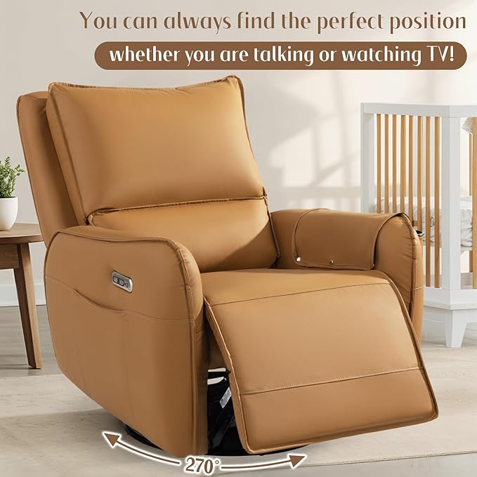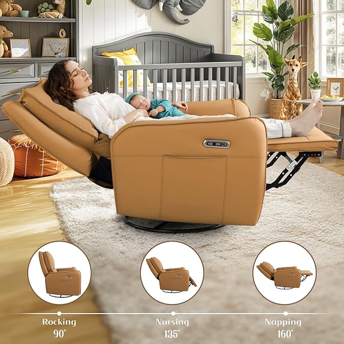- Power Swivel Glider Recliner: Rocking and reclining are the most desired features of a nursery glider, meanwhile it can also swivel. With our swivel rocker recliner, you can rock your little one gently to sleep, shift your direction to reach for something, or get out of the recliner chair conveniently. You can also press the electric button to make this chair recline to a more comfy position for a sweet nap.