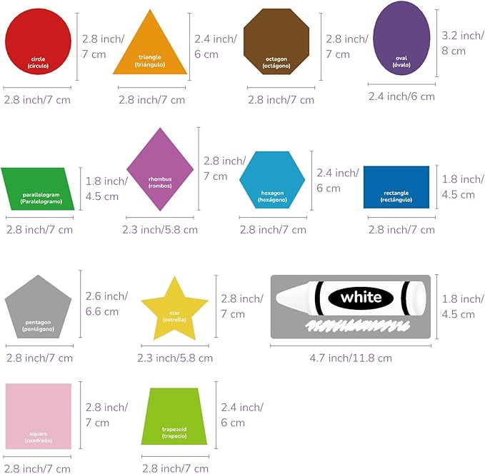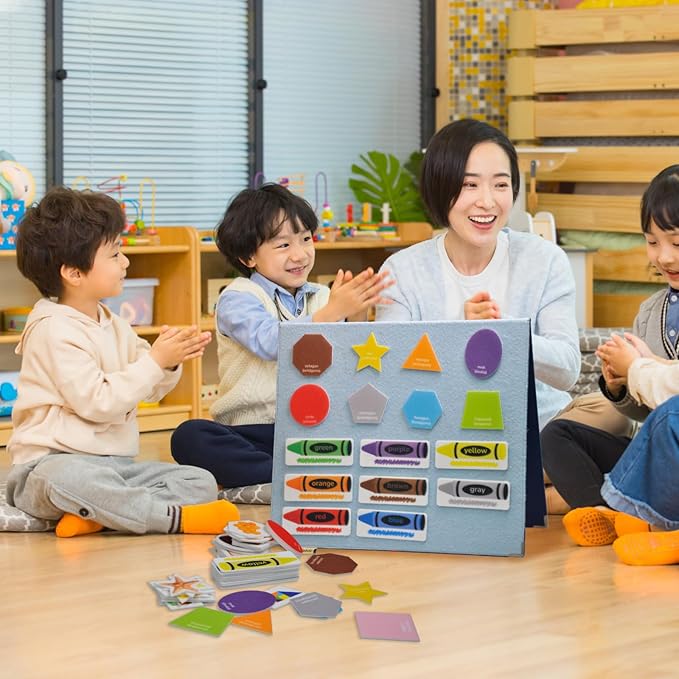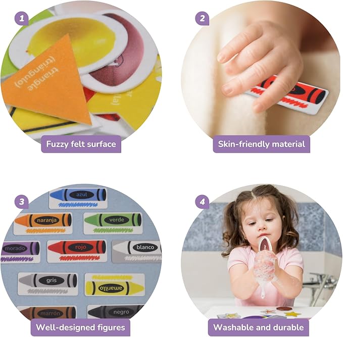- What's included:The Felt Color and Shape Sorter Set includes 12 geometric shape cards, 36 real-life object cards, 10 color cards in English and Spanish.This color and shape matching toy is portable, allowing children to learn anytime, whether traveling or on their way to school.
