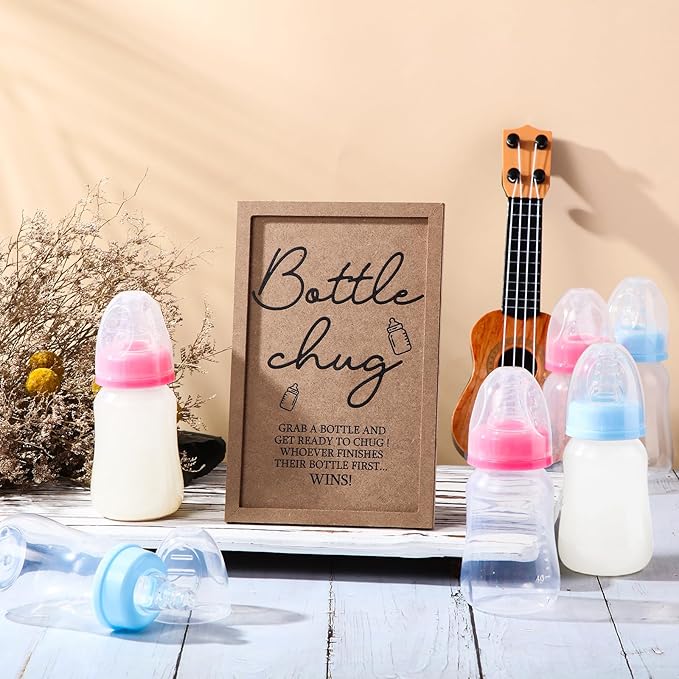 Roowest Bottle Chug Baby Shower Game Favors Including Kraft Theme Wooden Sign and 18 Pcs Baby Bottles for Gender Reveal Party Supplies