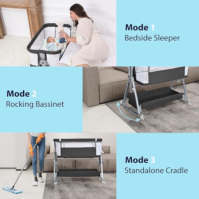 - 3 IN 1 BEDSIDE BASSINET FOR BABY: Luvkixen bedside bassinet for baby can function as a bedside sleeper, rocking bassinet or stand-alone baby crib. Easily switch between modes by adjusting the wheels or taking down the side bar. Plus, the lockable wheels ensure stability, giving you peace of mind while your baby sleeps.