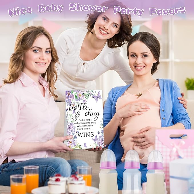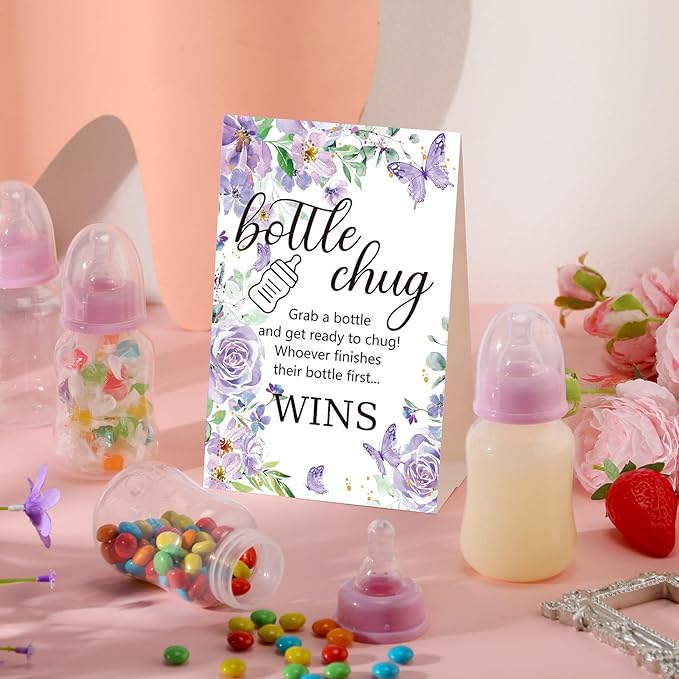 TrelaCo Bottle Chug Baby Shower Game 20 Pcs Baby Bottles Shower Favor with 1 Butterfly Theme Sign for Gender Reveal Party Supplies Gifts(Purple)