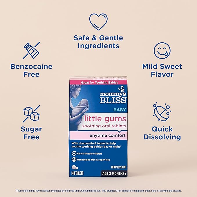 Mommy's Bliss Little Gums Soothing Oral Tablets, Great for Teething Babies, Benzocaine-Free & Sugar-Free, 2 Months+, 1 Bottle (140 Tablets)