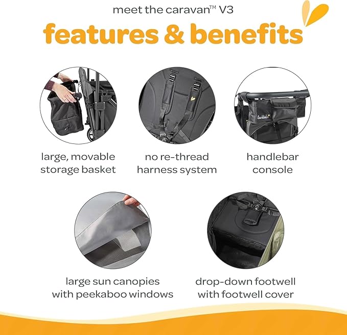 - Double Seat Wagon: Caravan V3 Stroller is created for families on the go with babies and toddlers, accommodating up to 2 children with reclining seats and a footwell that can be covered for flat seating.