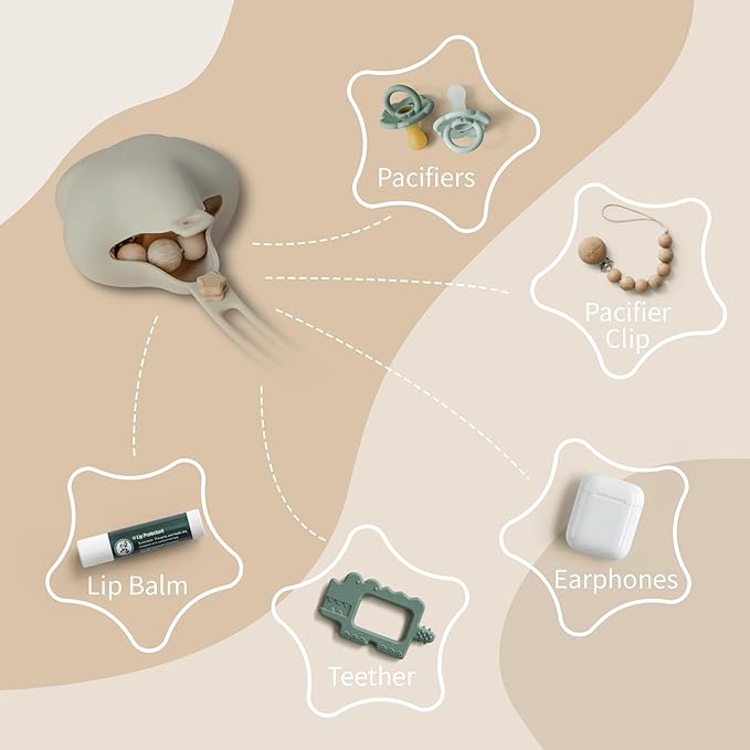 - Large Enough for Multiple Pacifiers and Easy to Take Along: Moonkie's Pacifier Holder is big enough to store up to two pacifiers, a pacifier chain, and teething toys; and once baby has grown up, you can use it for small essentials like lip balm, hair ties, or earbuds. Keep your baby's gear organized while on the move. The silicone button clasp is sturdy and dependable, ensuring nothing goes missing.