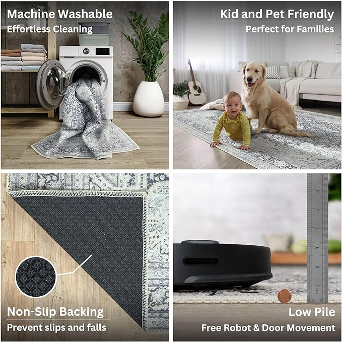 - MACHINE WASHABLE: Machine wash on delicate cycle (do not use bleach) at 85°F (30°C) and line dry or dry on air-only cycle without heat. Vacuum regularly and spot clean small stains. This easy to clean rug is perfect for families with kids and pets, and for high traffic areas.