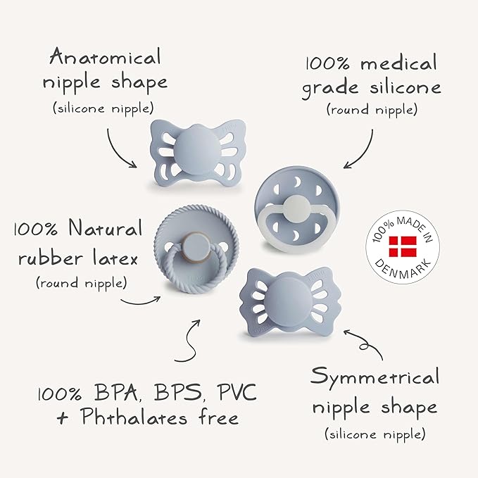- Craftsmanship and Safety: FRIGG Baby’s First Pacifier 4-pack set is 100% designed and made in Denmark and free from BPA, BPS, PVC and phthalates.