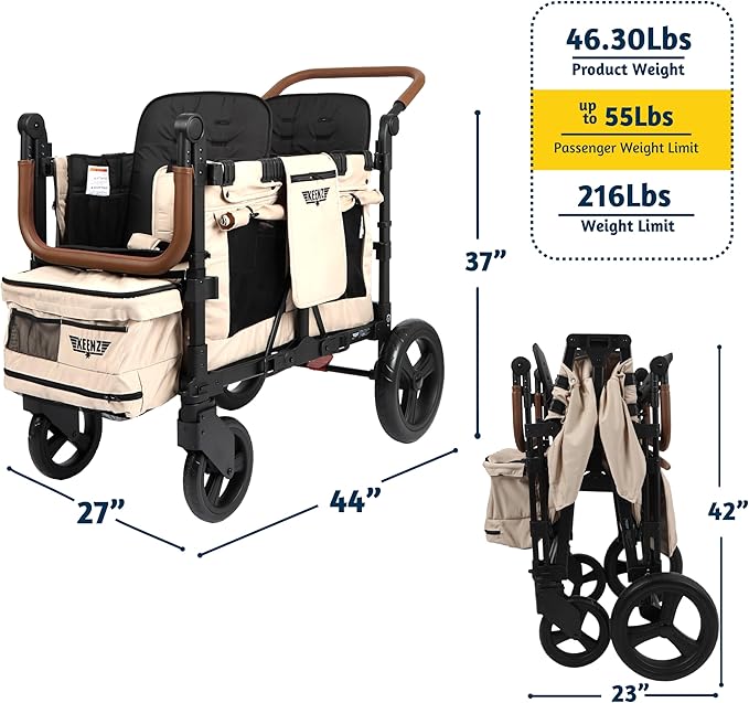 Keenz VYOO Stroller Wagon with Canopy - Foldable Design for Easy Storage, 5 Seating Positions for Kids, Enhanced Child Safety, All-Terrain Mobility, 2-Passengers, Mocha