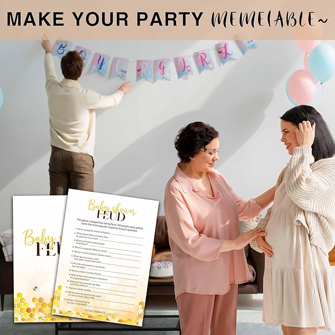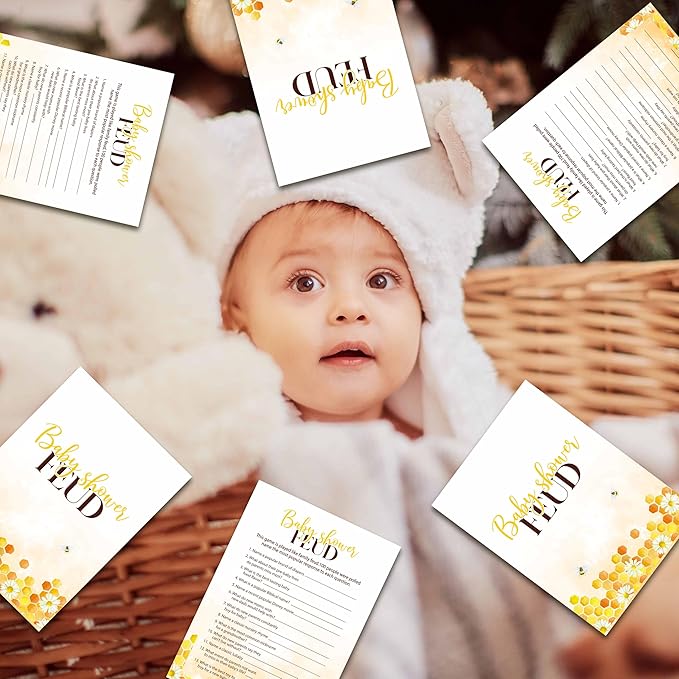Baby Shower Party Games, Baby Shower Feud Game, 25 Honey Bee Gender Reveal Party Games Cards (5" X 7"), Bumble Bee Baby Shower Supplies Decorations -02