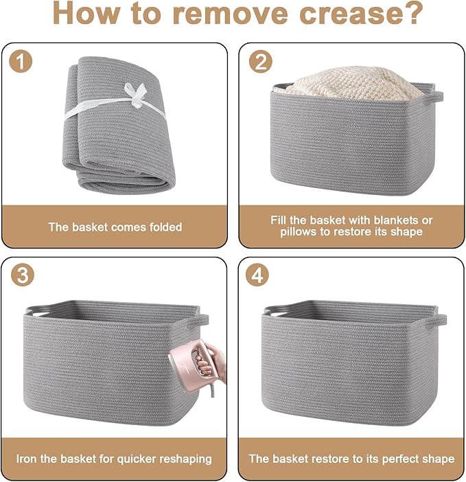 - Important Note: The premium woven storage baskets are packed compact for shipping, you may find some crease on the item, you can fully stuff the pillow basket with towels or clothes to restore shape. Or fast smoothing the creases by steaming or Ironing