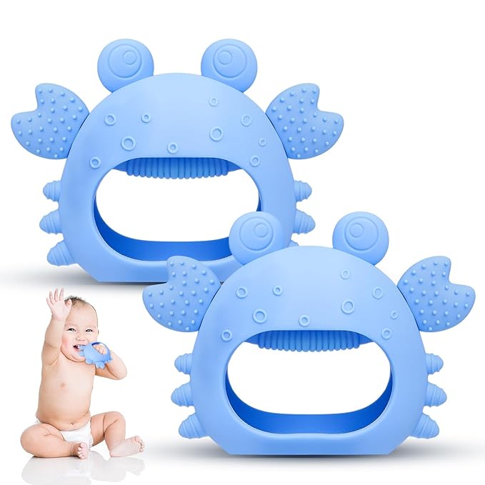 Anboor 2 Pack Baby Teething Toys, Silicone Teethers for Babies 0-6 Months Anti Dropping Hand Teether, Infant Baby Chew Toys for Teething Relief, for Newborn Soon-to-be Mothers (Blue,Crab)