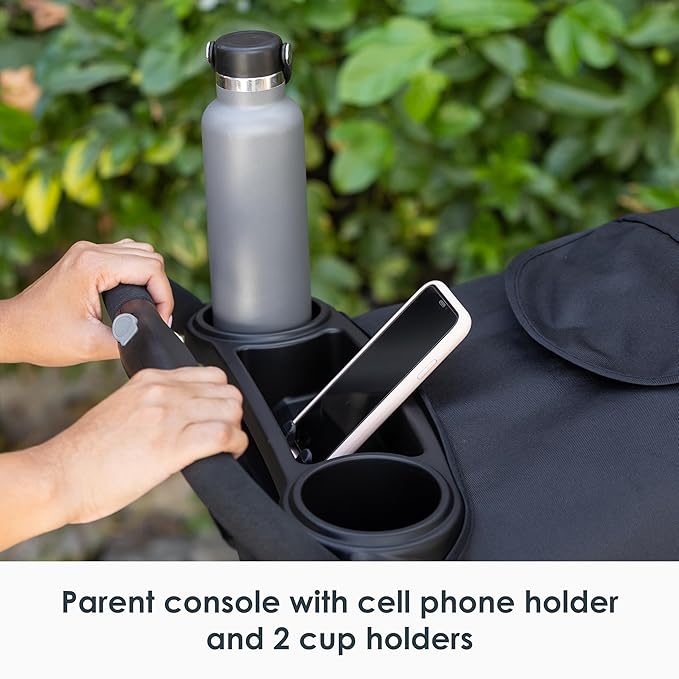 - Stroller includes a parent console with cell phone holder and 2 cup holders, removable/Swing away child trays with cup holders and snack areas, and a large basket with front and rear access