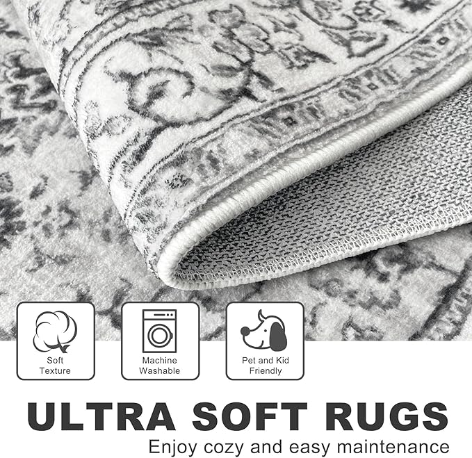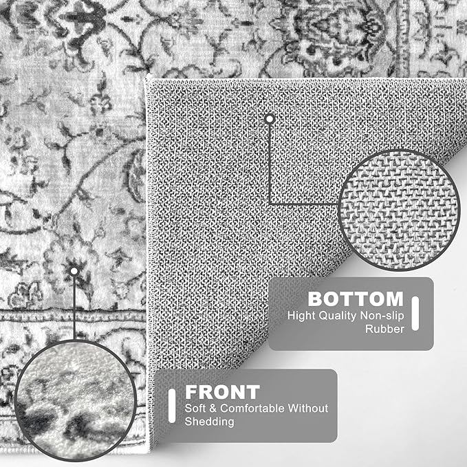 KILOCOCO Hallway Runner 2.6x10 Runner Rug Printed Vintage Floral Washable Rugs Kitchen Runners Soft Non-Slip Low Pile Rubber Backed Runners for Laundry Room Distressed Boho Rugs, Light Gray White