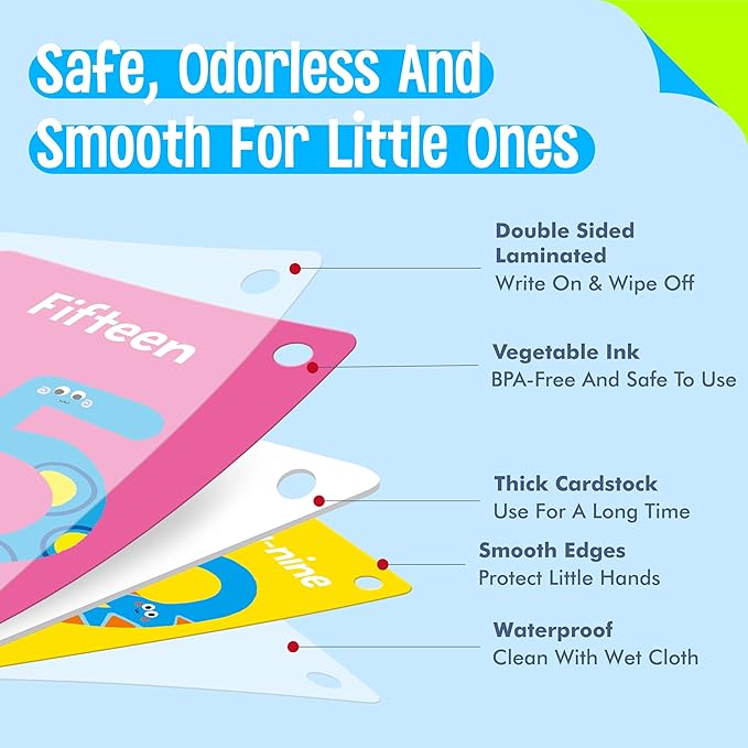 - Well Made: The card adopts sturdy and thickened paper material with PET film on both sides, durable and tear resistant. Printed with premium non-toxic vegetable oil-based ink, BPA-free and safe for babies to use. Bright colors and cute designs catch kidsβ eyes and evoke a sense of excitement and joy. When children are surrounded by these colorful flashcards, they are more likely to be engaged and interested in what they are learning.