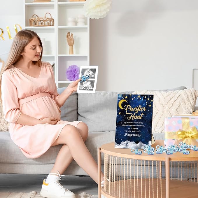 Thyle 51 Pcs Pacifier Hunt Baby Shower Games Include Hunt Sign and 50 Acrylic Pacifiers for Baby Shower Game Decoration Gift Sets Gender Reveal Party Decor(over the Moon)