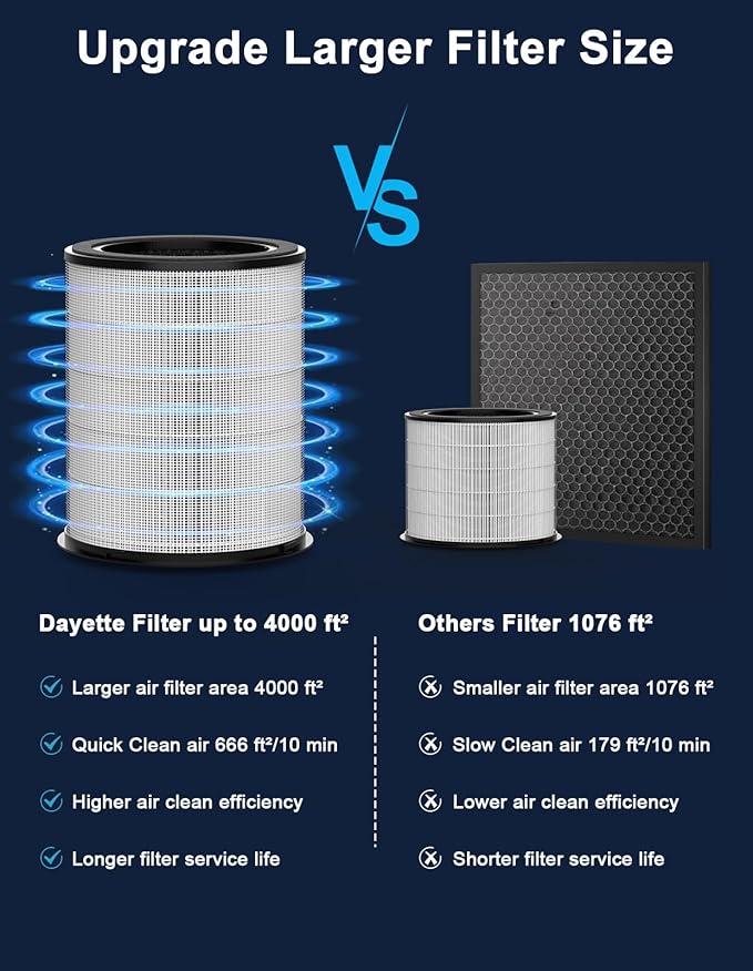 - 【SMART HOME SMARTER LIFE】 APP and Voice Control, works with Google Assistant and Alexa, enjoying hands-free experience. Dayette AP404 air purifier is 2.4GHz Wi-Fi enabled with Mobile Smart home life APP. Monitor your indoor air quality in real-time, control from your device, including turning off/on, changing modes or fan speed, creating a schedule, and using a timer (1-12H), show your filter usage and one step to order replacements filter.