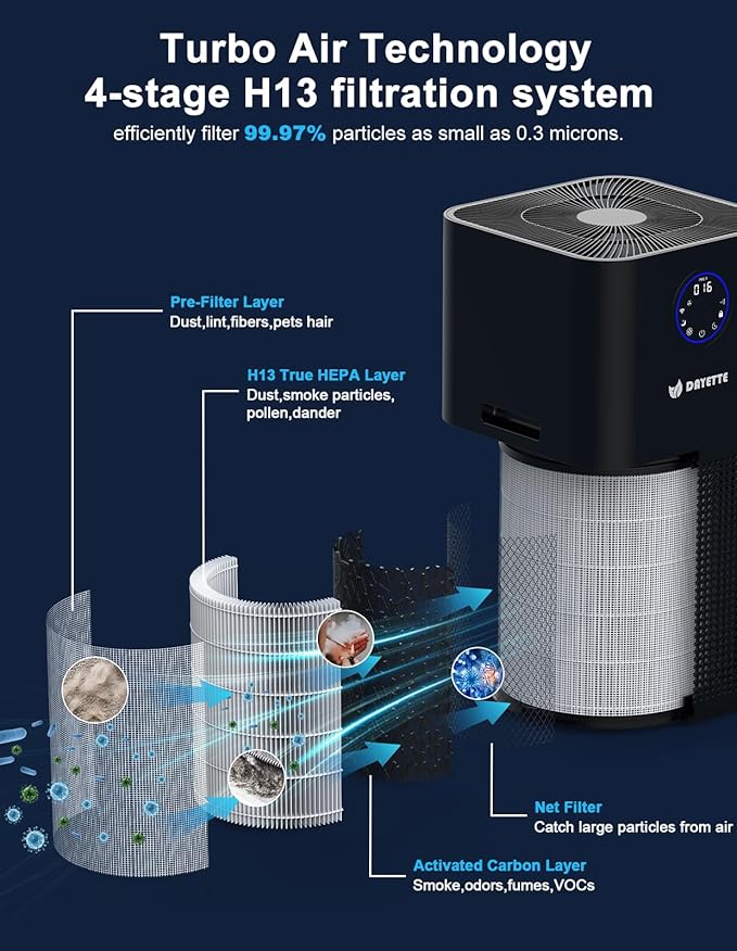 - 【H13 TRUE HEPA FILTER】Our HEPA air purifier equipped with a 4-Stage Filtration system, works alongside the Pre-Filter and High-Efficiency Activated Carbon Filter to capture 99.97% of airborne particles 0.3 microns in size, physically absorbs dust, smoke, pollen, odor, pet dander, especially effective for cooking smells or multi-pet household.Also helps you combat dry throats, nightly congestion, and asthma.