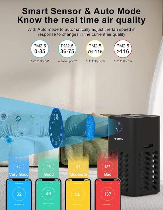 - 【KNOW YOUR AIR BETTER】This air cleaner with built-in PM2.5 sensitive infrared air quality sensor, a color-coded light change from blue/very good to green/good to yellow/moderate to red/polluted on the display and in the App, and automatically adjusting the fan speed in response to changes in the current air quality.