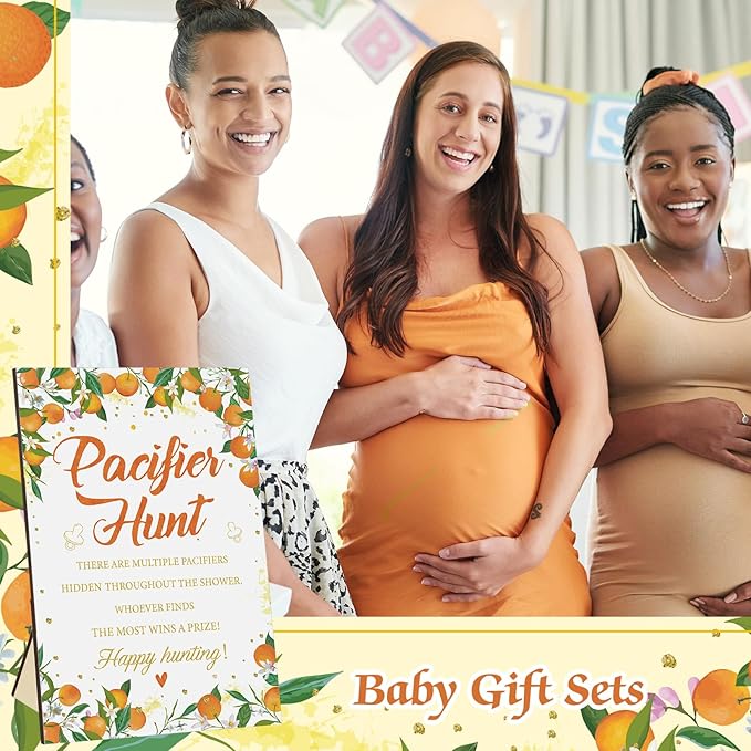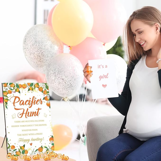 - Cute Little Cutie Design: the Little Cutie themed pacifier hunt board sign is printed with cute orange design of the baby shower bottle game sign add a touch of elegance and sophistication to your party, making it a good choice for those seeking to enhance their decor and add a cute touch to their event, fitting the party theme