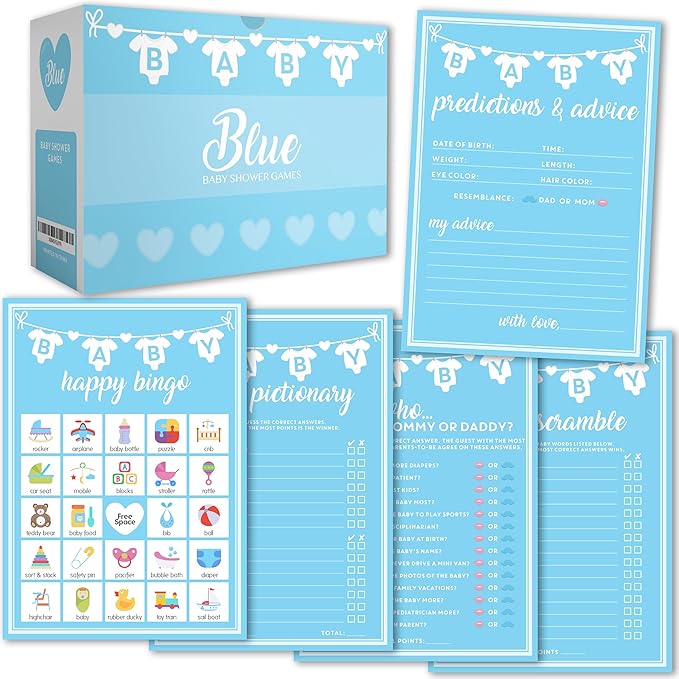 Party Hearty Baby Shower Games for Boy, 250 pcs Blue 5 Games Activities Cards, Funny Baby Shower Games, Baby Shower Ideas