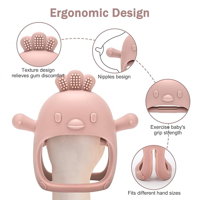 - Soothe Baby Sore Teether:Imitate pacifier&nipple shape, and the soft silicone touch point massage granules privide the teething pain relief and satisfy different bite experiences. the cute chick glove silicone teether improve baby's teeth occlusion ability, it will helps gum stimulation and teeth growth.